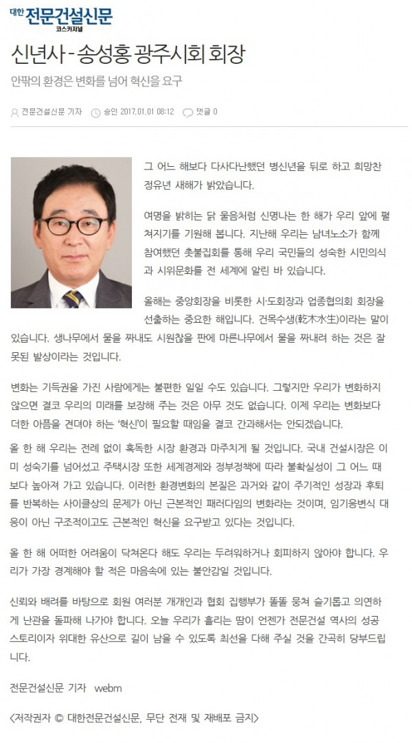 신년사 - 송성홍 광주시회 회장 (대한전문건설신문)