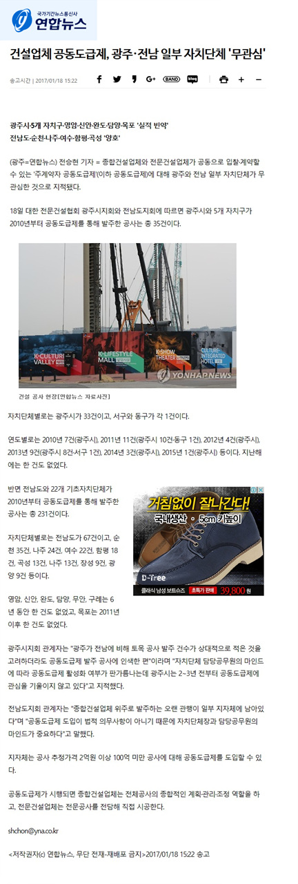 HOME > KOSCA광주 소개 > 건설업체 공동도급제, 광주.전남 일부 자치단체 \'무관심\' (연합뉴스) > 보도자료