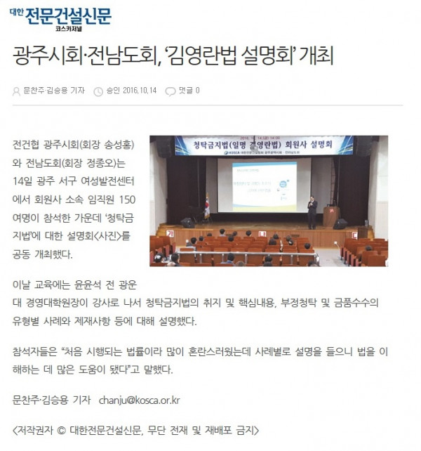 광주시회·전남도회, ‘김영란법 설명회’ 개최 (대한전문건설신문)