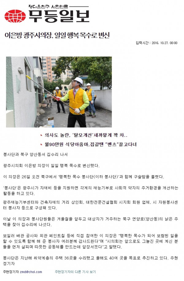 이은방 광주시의장, 저소득 가정 집수리 봉사 (호남매일)