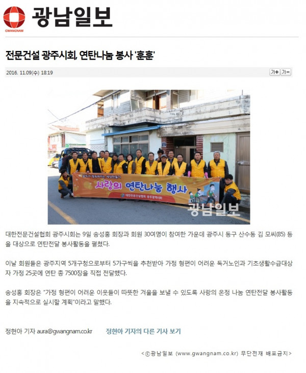 전문건설 광주시회 ‘사랑의 연탄 전달’ (무등일보)