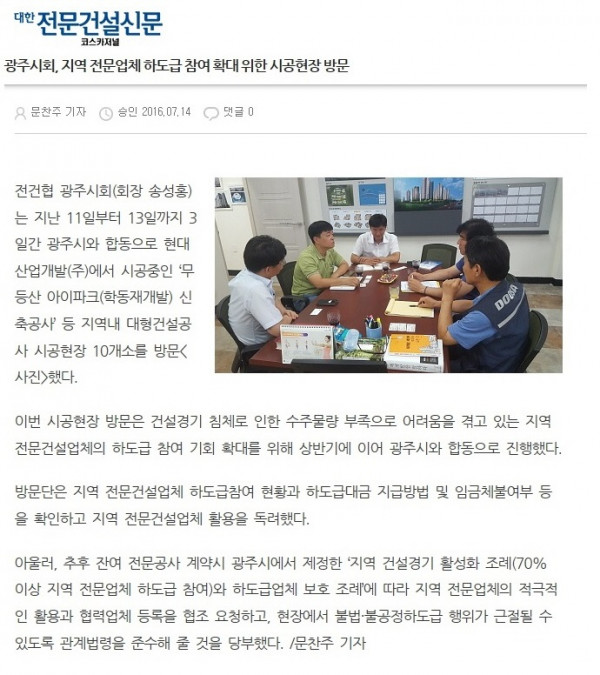 지역 전문업체 하도급 참여 확대 위한 시공현장 방문 (대한전문건설신문)