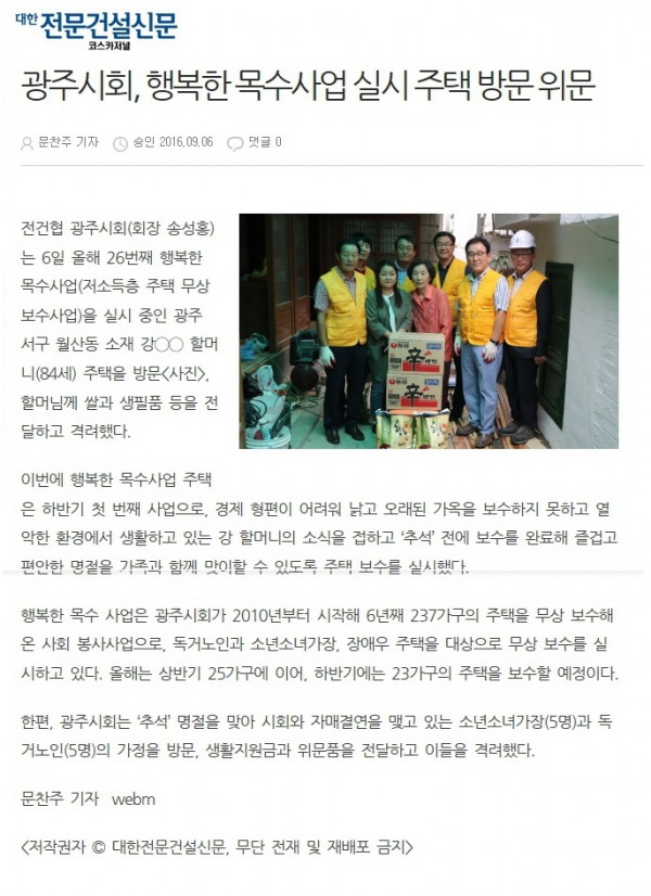 광주시회, 행복한 목수사업 실시 주택 방문 위문 (대한전문건설신문)