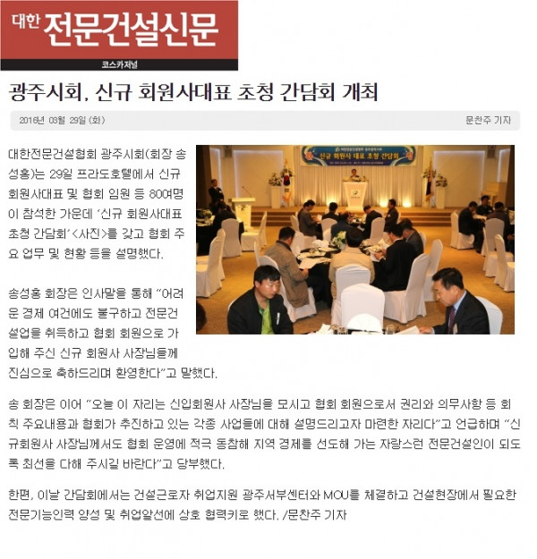 광주시회, 신규 회원사대표 초청 간담회 개최 (대한전문건설신문)