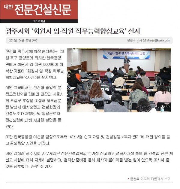 HOME > KOSCA광주 소개 > 광주시회 ‘회원사 임·직원 직무능력향상교육’ 실시 (전문건설신문) > 보도자료