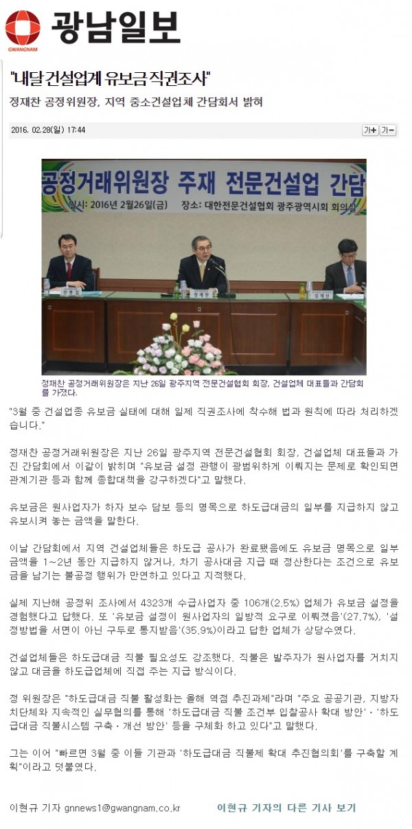 "건설업계 유보금 관행 뿌리 뽑겠다." (광주일보)