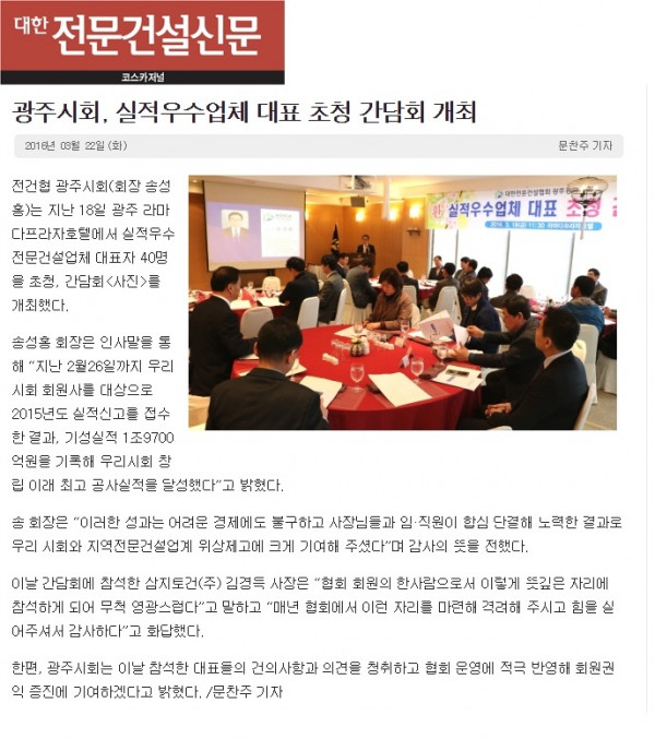 광주시회, 실적우수업체 대표 초청 간회 개최 (대한전문건설신문)