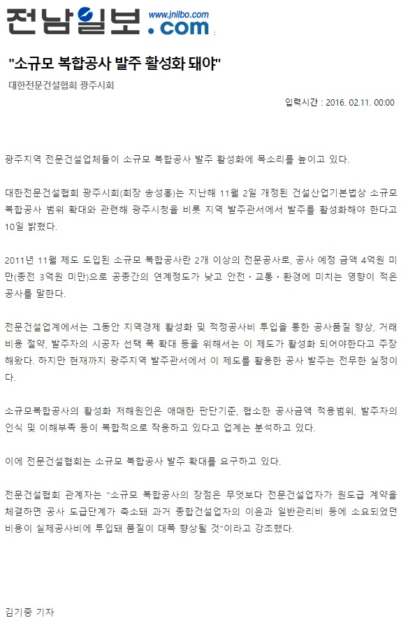 "소규모 복합공사 발주 활성화 돼야" (전남일보)