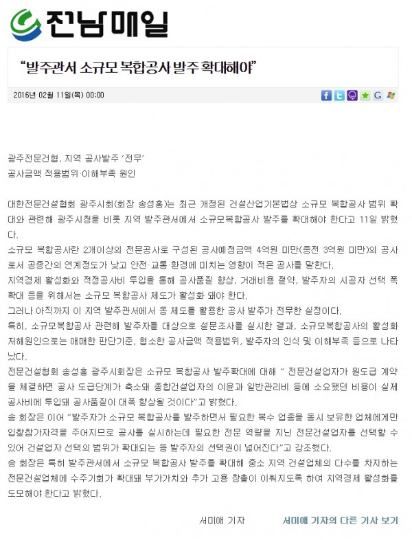 “발주관서 소규모 복합공사 발주 확대해야” (전남매일)