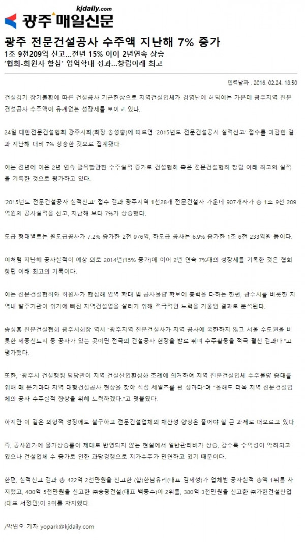 광주지역 전문건설업체 사상 최대 실적 (남도일보)