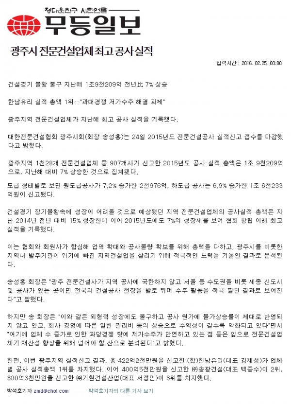 광주지역 전문건설업체 사상 최대 실적 (남도일보)