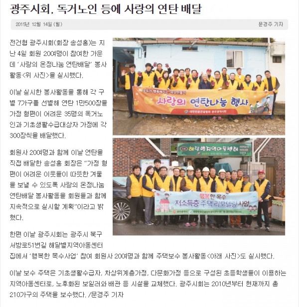 광주시회, 독거노인 등에 사랑의 연탄 배달 (대한전문건설신문)