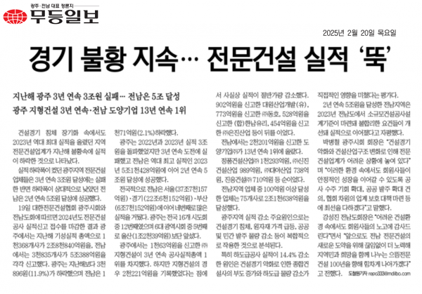 경기 불황 지속... 전문건설 실적 '뚝' (무등일보)