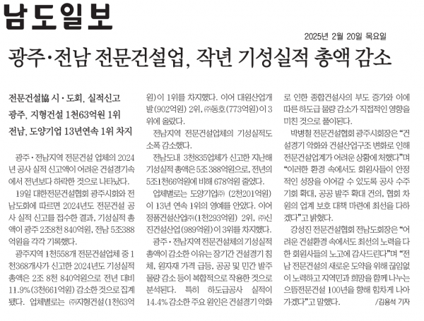 광주.전남 전문건설업, 작년 기성실적 총액 감소 (남도일보)