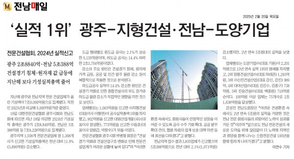 '실적 1위' 광주-지형건설 전남-도양기업 (전남매일)