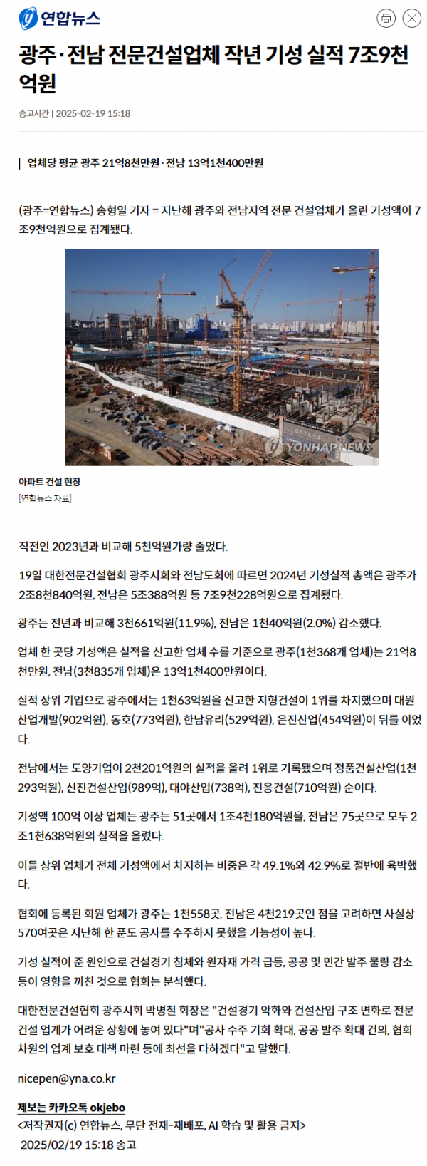 광주.전남 전문건설업체 작년 기성 실적 7조9천억원 (연합뉴스) 페이지 정보 작성자 전문건설협회광주광역시회 댓글 0건 조회 1,404회 작성일 2025-02-20 11:08 목록 본문