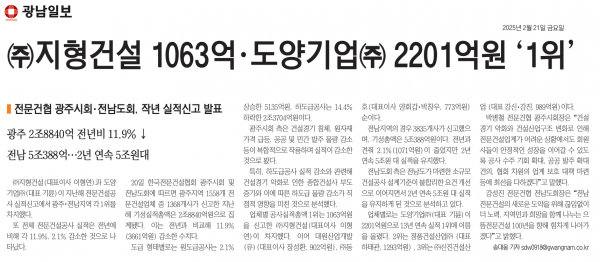 (주)지형건설 1063억. 도양기업(주) 2201억원 '1위' (광남일보) 페이지 정보 작성자 전문건설협회광주광역시회 댓글 0건 조회 1,345회 작성일 2025-02-21 09:01 목록 본문