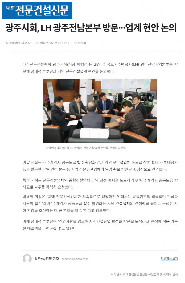 광주시회, LH 광주전남본부 방문···업계 현안 논의 (대한전문건설신문) 페이지 정보 작성자 전문건설협회광주광역시회 댓글 0건 조회 1,257회 작성일 2025-02-26 10:33 목록 본문