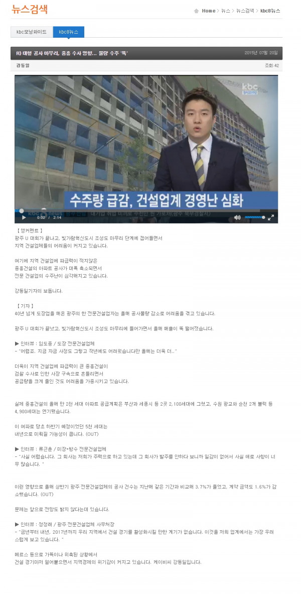 대형 공사 마무리, 중흥 수사 영향... 물량 수주 (KBC광주방송) 페이지 정보 작성자 문경주 댓글 0건 조회 2,769회 작성일 2015-07-23 15:04 목록 본문 ▣ 동영상 시청http://www.ikbc.co.kr/jw_2ds/index.html?code=main_news_02&mode=list&type=&page=3&keyfield=&key=&menu_id=56:65:73&uid=243147&mode=view