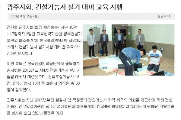광주시회, 건설기능사 실기 대비 교육 시행 (대한전문건설신문)