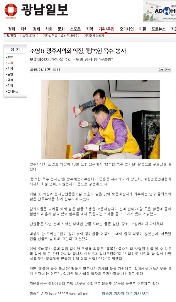 조영표 광주시의회 의장, "행복한 목수" 봉사 (광남일보, 광주매일신문)