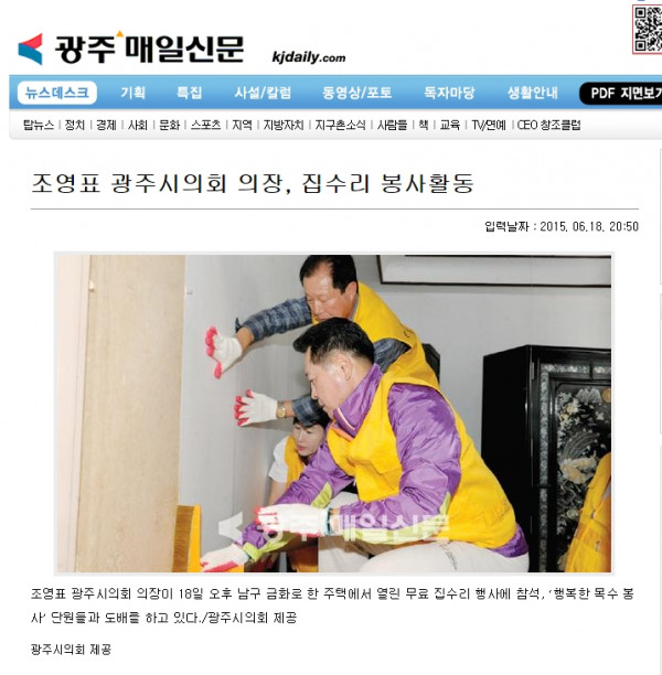HOME > KOSCA광주 소개 > 조영표 광주시의회 의장, "행복한 목수" 봉사 (광남일보, 광주매일신문) > 보도자료