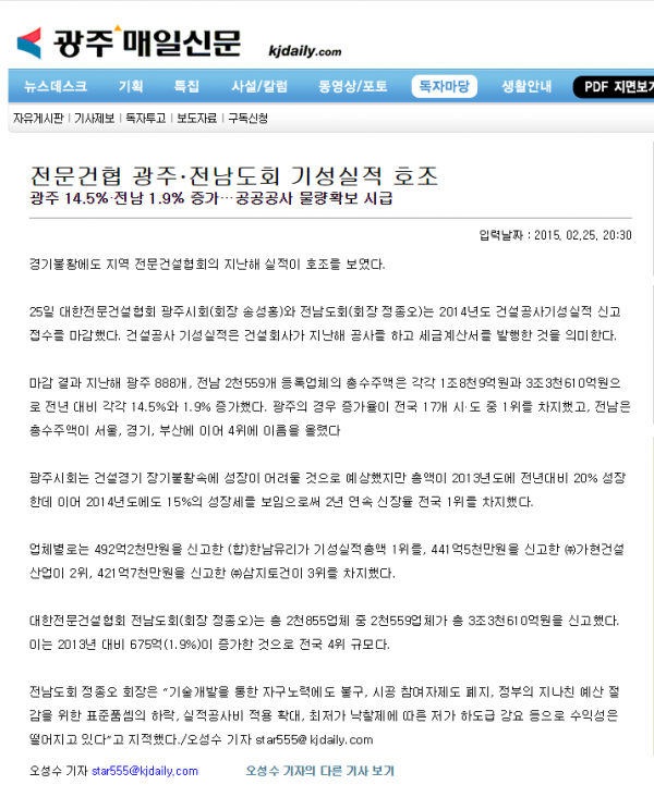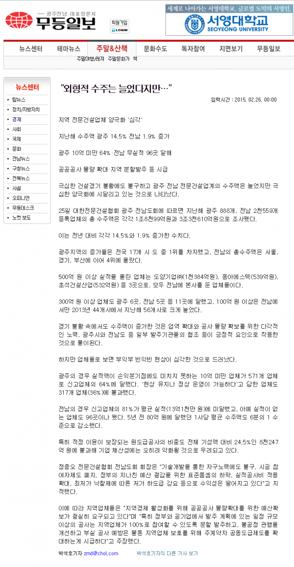 지역 전문건설업체 양극화 '심각' (무등일보, 광주매일신문)
