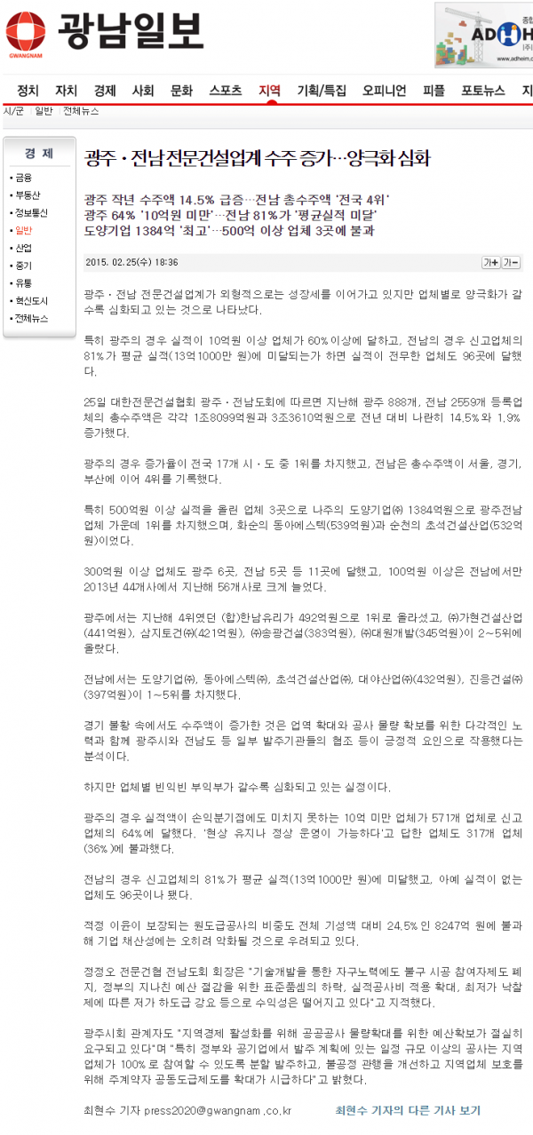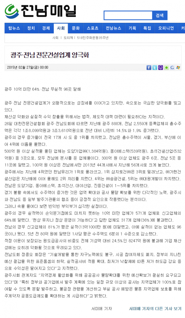 광주.전남 전문건설업계 양극화 (전남매일, 광남일보)