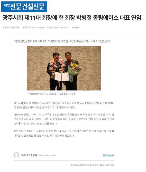 광주시회 제11대 회장에 현 회장 박병철 동림에이스 대표 연임 (대한전문건설신문) 페이지 정보 작성자 전문건설협회광주광역시회 댓글 0건 조회 1,752회 작성일 2024-10-17 12:50 목록 본문