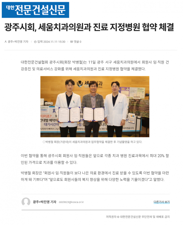 광주시회, 세움치과의원과 진료 지정병원 협약 체결 (대한전문건설신문) 페이지 정보 작성자 전문건설협회광주광역시회 댓글 0건 조회 1,599회 작성일 2024-11-11 17:47 목록 본문