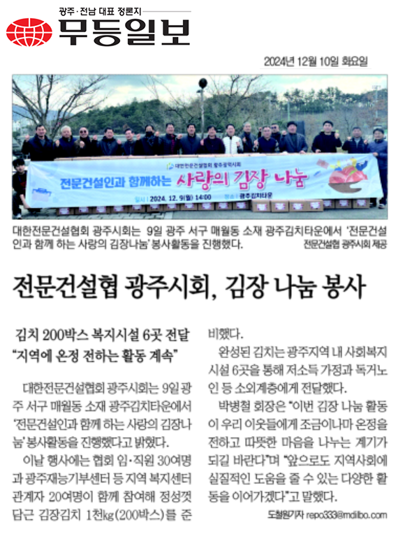 광주시회, 사랑의 김장나눔 봉사활동 실시 (대한전문건설신문)