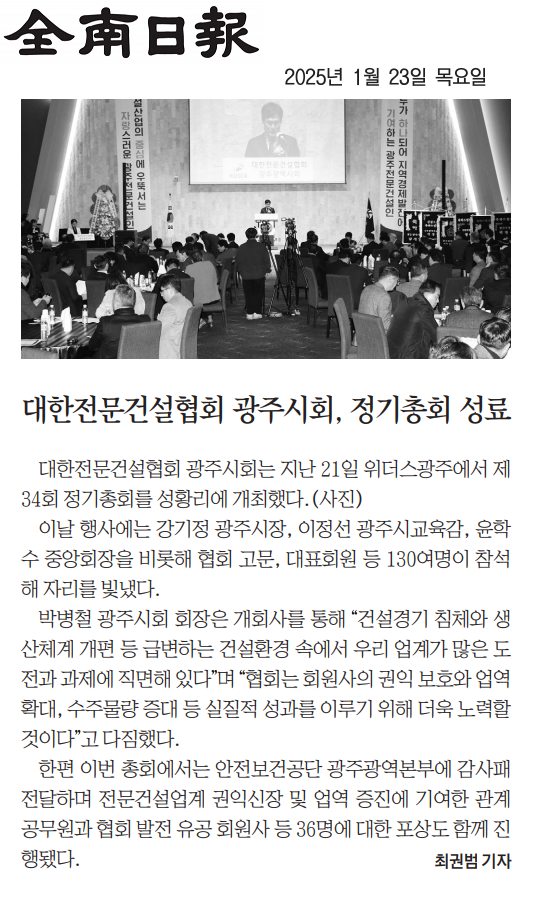 대한전문건설協 광주시회, 제34회 정기총회 '성료' (남도일보)