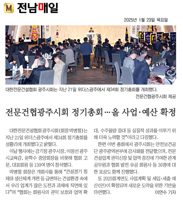 전문건협광주시회 정기총회... 올 사업.예산 확정 (전남매일) 페이지 정보 작성자 전문건설협회광주광역시회 댓글 0건 조회 1,320회 작성일 2025-01-24 09:23 목록 본문