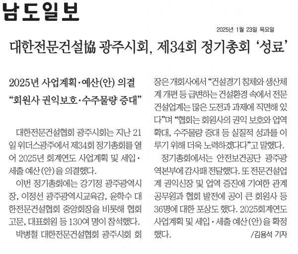 대한전문건설協 광주시회, 제34회 정기총회 '성료' (남도일보) 페이지 정보 작성자 전문건설협회광주광역시회 댓글 0건 조회 1,325회 작성일 2025-01-24 09:25 목록 본문