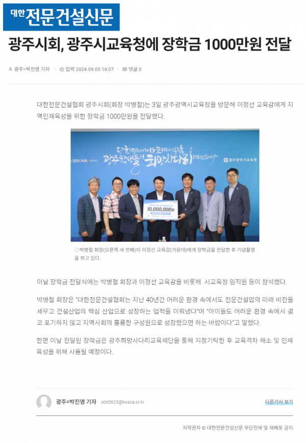 광주시회, 광주시교육청에 장학금 1000만원 전달 (대한전문건설신문) 페이지 정보 작성자 전문건설협회광주광역시회 댓글 0건 조회 1,832회 작성일 2024-09-04 09:36 목록 본문