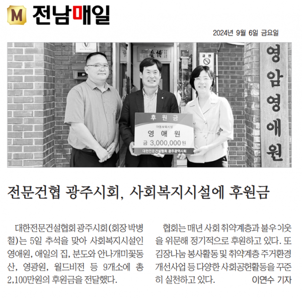 전문건설協 광주시회, 복지시설 후원금 전달 (광주매일신문)