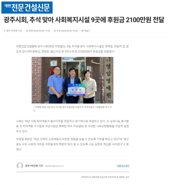 광주시회, 추석 맞아 사회복지시설 9곳에 후원금 2100만원 전달 (대한전문건설신문) 페이지 정보 작성자 전문건설협회광주광역시회 댓글 0건 조회 1,694회 작성일 2024-09-09 09:48 목록 본문