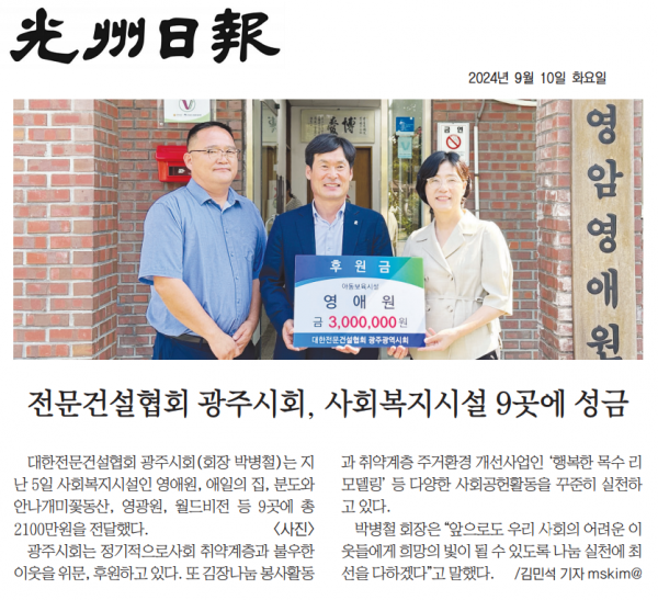 전문건설協 광주시회, 복지시설 후원금 전달 (광주매일신문)