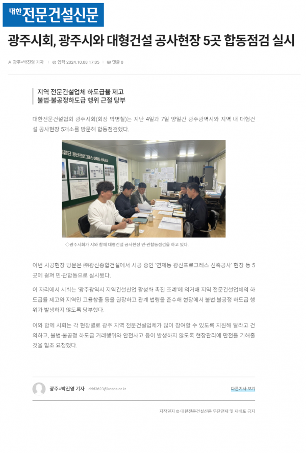 광주시회, 광주시와 대형건설 공사현장 5곳 합동점검 실시 (대한전문건설신문) 페이지 정보 작성자 전문건설협회광주광역시회 댓글 0건 조회 1,615회 작성일 2024-10-10 09:57 목록 본문