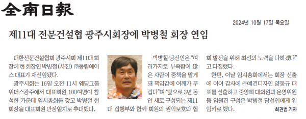 제11대 전문건설협회 광주시회장에 박병철 회장 연임 (전남일보) 페이지 정보 작성자 전문건설협회광주광역시회 댓글 0건 조회 1,639회 작성일 2024-10-17 11:58 목록 본문