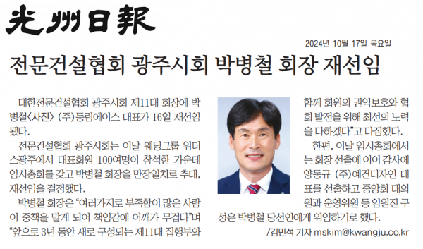 HOME > KOSCA광주 소개 > 전문건설협회 광주시회 박병철 회장 재선임 (광주일보) > 보도자료