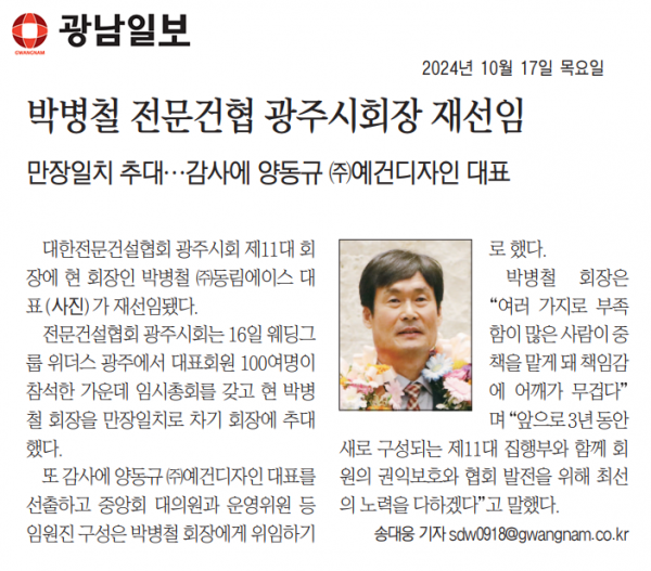 HOME > KOSCA광주 소개 > 박병철 전문건협 광주시회장 재선임 (광남일보) > 보도자료