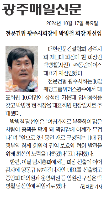 전문건협 광주시회장에 박병철 회장 재선임 (광주매일신문)