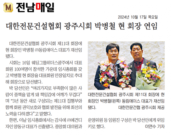 대한전문건설협회 광주시회 박병철 현 회장 연임 (전남매일)