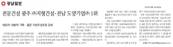 전문건설 광주 (주)지형건설.전남 도양기업(주) 1위 (광남일보) 페이지 정보 작성자 전문건설협회광주광역시회 댓글 0건 조회 2,079회 작성일 2024-08-01 10:54 목록 본문