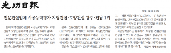 전문건설업체 시공능력평가 지형건설.도양건설 광주.전남 1위 (광주일보) 페이지 정보 작성자 전문건설협회광주광역시회 댓글 0건 조회 1,916회 작성일 2024-08-01 10:55 목록 본문