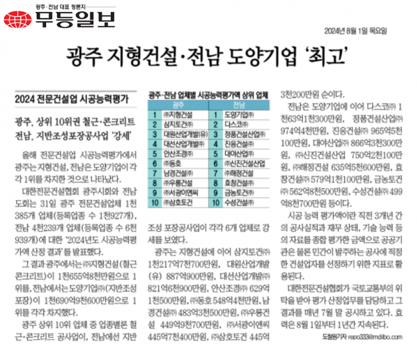 전문건설 시공능력, 광주 지형건설.전남 도양기업 1위 (전남매일)