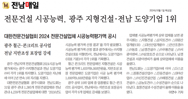 전문건설 시공능력, 광주 지형건설.전남 도양기업 1위 (전남매일) 페이지 정보 작성자 전문건설협회광주광역시회 댓글 0건 조회 2,073회 작성일 2024-08-01 10:56 목록 본문