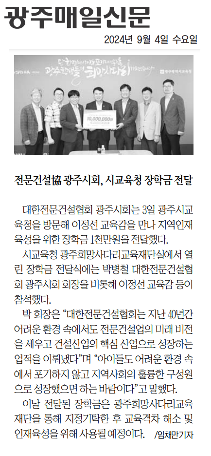 전문건설協 광주시회, 시교육청 장학금 전달 (광주매일신문)