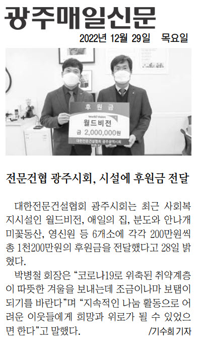 전문건설협 광주시회, 사회복지시설 후원금 전달(무등일보)